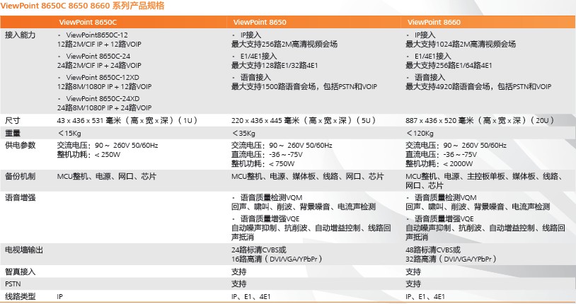 線路接入:IP、4E1/E1(ViewPoint 8660/8650),會(huì)場(chǎng)接入帶寬64K ~ 8M,可混合組網(wǎng);支持通過(guò)PRI接入PSTN電話和3G語(yǔ)音。