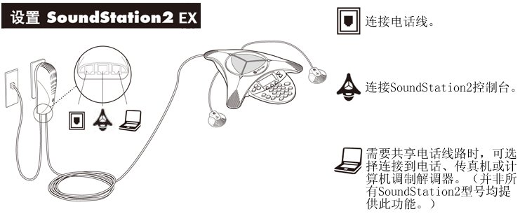 SoundStation2包括: 桌面主機,集成了顯示屏和鍵盤 6.4m線纜,連接主機; 2.1m電話線,連接RJ-11接座; 用戶文檔(用戶指南CD、快速安裝指南、注冊卡) |